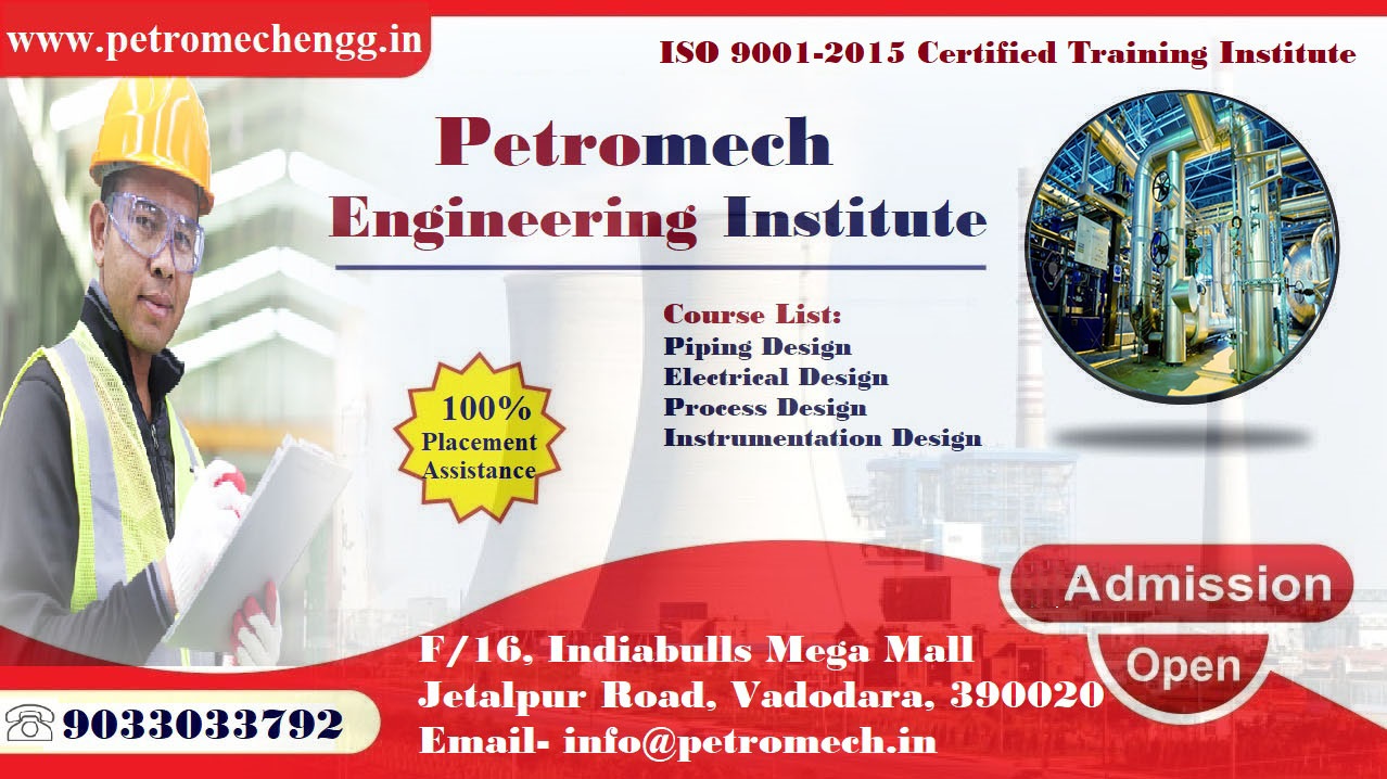 Admission open at Petromech Institute - Vadodara Top Course: |Piping Design| |Electrical Design| |Process Design| |Instrumentation Design| Duration: 2 Months (Regular Batch) 4 Months (Only Sunday Batch) 10 Days (Fast Track Batch)