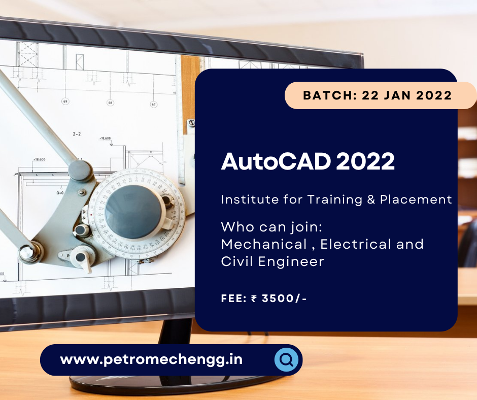 AutoCAD 2022 Training with Placement @Petromech Institute Vadodara Training Duration: 50 Hours Training Fee: ₹ 3500/- Training Mode: Online Live / Classroom Training Note: Enroll in group and get discount. Who can enroll: 1- Mechanical Engineer 2- Electrical Engineer 3- Civil Engineer Contact us: 7202998636, 9429292029