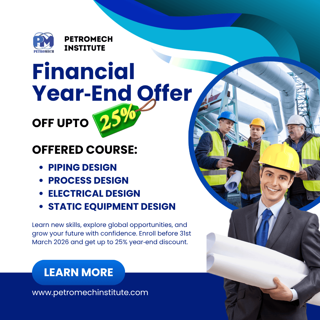Get up to 25% OFF on our job-oriented engineering courses! Courses Available: • Piping Design • Process Design • Electrical Design • Static Equipment Design Batch Options: • Regular Batch (Weekdays) • Sunday Batch (For working professionals) Training Mode: • Online Live Classes • Offline Classroom Training Learn new skills, improve your career, and get better job opportunities! Offer valid till 31st March 2026 – Don’t miss it! Contact us today & start your career journey