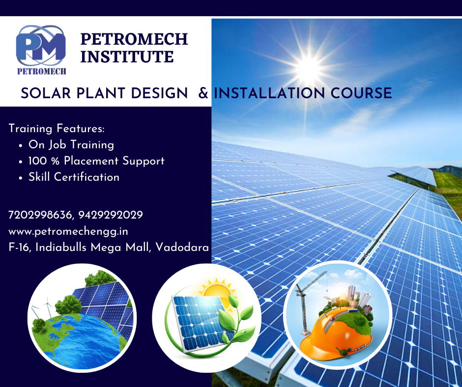Join Solar Plant Design and Installation Course @ Petromech Institute: Vadodara Course Details: • Duration: 60 Hours • Eligibility: ITI / Diploma / Degree in any • Batch Type: Regular Training Features: • Classroom training and on job training • Placement support until get the job • Skill Certification Contact Us: • 7202998636, 9429292029 • info@petromech.in • www.petromechengg.in