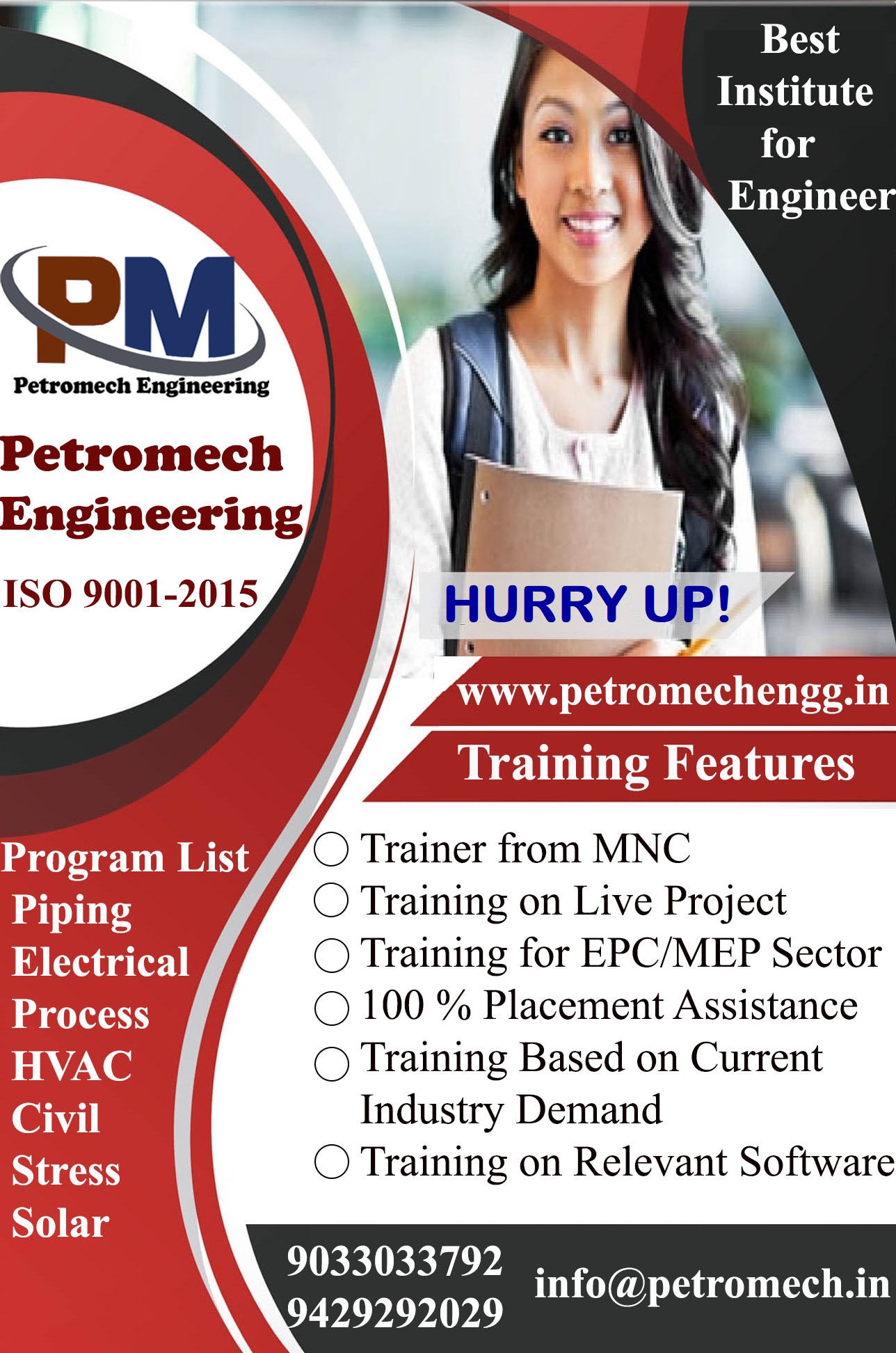 Petromech Engineering Institute – Vadodara Training Features:- Trainer from Big MNC (12+ Years of Experience) Providing Study Materials hard copy & Soft copy designed by expert Providing Technical Drawings & Documents Job Oriented Training Program based on current Industry Demands Training on Computer Aided Drafting, Modelling and Designing Software Training on Live Project 100% Placement Assistance to all engineers More Than 90% Placed Candidate in 2018-19 Main Program List:- |Piping Design | |Electrical Design | |Process Design | |Instrumentation Design |
