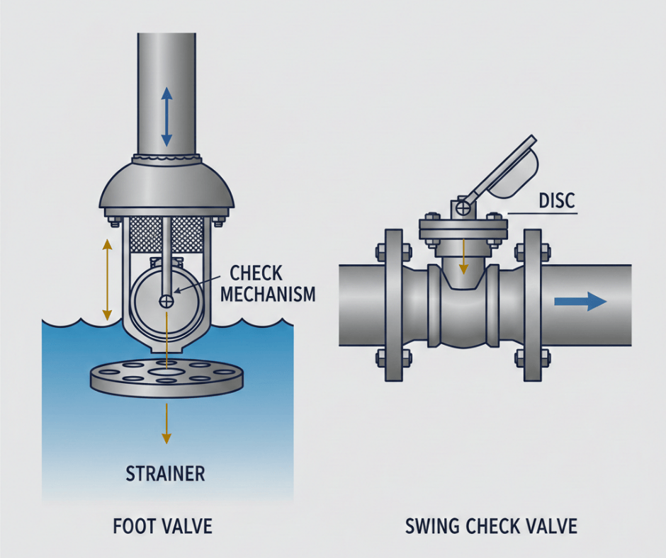 1. What is a Foot Valve? A foot valve is a one‑way valve that is fixed at the bottom end of a pump’s suction pipe. Its main purpose is to let water enter the pipe when the pump starts and to stop the water from flowing back when the pump stops. Because it is placed at the “foot” of the pipe, it is called a foot valve. This valve helps the pump remain filled with water, which means the pump does not need to be primed again and again. Foot valves are commonly used in wells, borewells, and irrigation systems. They usually come with a strainer or filter that prevents dirt and debris from entering the pump. By keeping the water from flowing backward, the foot valve protects the pump, saves energy, and ensures smooth operation. 2. What is a Check Valve? A check valve is also a one‑way valve, but it can be installed anywhere in a pipeline, not just at the bottom. Its job is to allow fluid to move in the correct direction and automatically close if the fluid tries to flow backward. This prevents reverse flow, which can damage pumps, meters, and other equipment. Check valves are used in water supply lines, industrial systems, oil and gas pipelines, chemical plants, and many other applications. They help maintain pressure, avoid contamination, and protect machinery from sudden pressure changes. A check valve works like a gate that opens only when the flow is moving forward and shuts tightly if the flow tries to reverse. 3. Difference Between Foot Valve and Check Valve A foot valve is a special type of check valve designed specifically for the suction side of a pump, and it is always installed at the bottom of the suction pipe. It usually includes a strainer to block dirt. A check valve, on the other hand, can be placed anywhere in the pipeline and does not come with a strainer. While both valves prevent backflow, a foot valve mainly helps keep the pump primed, whereas a check valve is used to protect the entire system from reverse flow. Foot valves must be installed vertically, while check valves can be installed either horizontally or vertically depending on the design. 4. Summary A foot valve is a one‑way valve used at the bottom of a pump’s suction pipe to stop water from flowing back and to keep the pump ready for the next start. A check valve is a general one‑way valve used anywhere in a pipeline to prevent reverse flow and protect the system. Both valves improve efficiency and safety in fluid systems. |Best Piping Institute| |Piping Course for Mechanical| |Piping Course for Chemical|