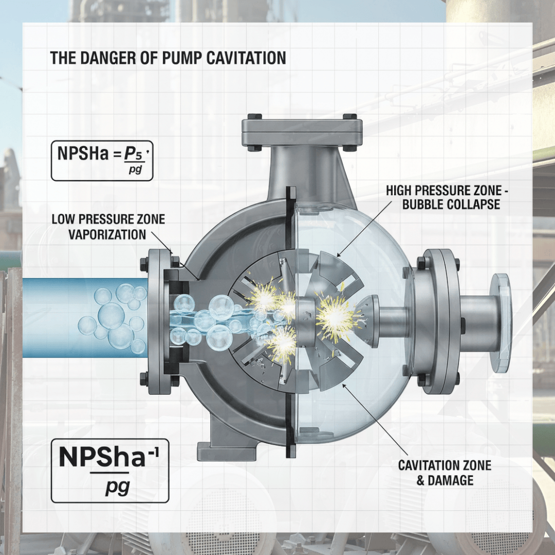 Net Positive Suction Head (NPSH) is one of the most important concepts in pump engineering. It helps us understand whether a pump will run smoothly or face problems like cavitation, which can damage the pump. When students and engineers learn NPSH in simple language, they can easily design safer and more efficient pumping systems. What is NPSH? NPSH tells us how much pressure is available at the pump suction compared to the liquid’s vapor pressure. If this pressure is too low, the liquid starts boiling inside the pump. This creates bubbles that collapse violently — a process called cavitation. Cavitation causes: • Noise and vibration • Damage to impeller • Reduced flow and head • Short pump life So, calculating NPSH correctly helps us avoid cavitation and keep the pump healthy. NPSH Formula There are two types of NPSH: 1. NPSH Available (NPSHa) This is the pressure actually available at the pump suction. NPSHa = (Ps - Pv) / (ρ × g) + Hs - hf Where: • Ps = Suction pressure • Pv = Vapor pressure of liquid • ρ = Density of liquid • g = Acceleration due to gravity • Hs = Static suction head (positive) or lift (negative) • hf = Friction losses in suction line 2. NPSH Required (NPSHr) This is the minimum NPSH the pump needs to avoid cavitation. It is provided by the pump manufacturer. Golden Rule: NPSHa > NPSHr If NPSHa is less than NPSHr, cavitation will occur. Why NPSH calculation is important? • Ensures smooth pump operation • Prevents cavitation damage • Increases pump life • Reduces maintenance cost • Helps in selecting correct pump and piping design • Improves safety and reliability of the system For industries like chemical, water supply, oil & gas, and HVAC, NPSH is a critical design parameter. |Best Process Engineering Institute in India| |Petromech-Best Process Design Institute| |Chemical Process Engineering Course|